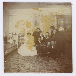 Update - 2009: Black & white print. Snapshot. Image of a group of men & women seated inside a home. Floral carpet on floor. Couch, plant & table & bakers rack on right; glass enclosed bookcase/chest of drawers at left background next to a window with lacy curtains. 5 young men in black suits; one holding a feather duster. 4 young women - one dressed in white; one in dark dress, other two in dark skirts and jackets with white blouses.