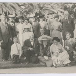 Update - 2009: Black & white print. Printed on postcard paper. Image of a group of people posed on a lawn in front of palm trees. Family portrait - several generations from infant to old folks.