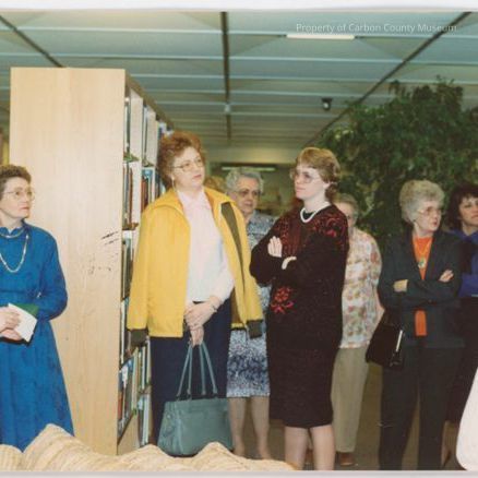 C-9 women standing in a room at a library, 8 are facing a woman in a blue shirt and blue skirt, on the table next to her are stacks of books and a telephoneCollection