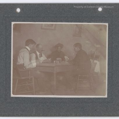 Update 2/2010: Sepia print. Snapshot mounted on grey matboard with floral border and two binding holes in top edge. Image of four men seated at a wooden table playing cards. There are poker chips stacked in the center of the table. Three framed pictures hang on the wall behind them. all are casually dressed, one man is smoking a cigar. One man is wearing a hat.