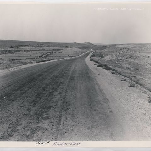 Update 2009: Black and white print of road way over rolling hills. Railroad tracks can be seen on photo left .Snow fences on hill beyond tracks. Road signs can be seen along road in distance . Road is wide in foreground and narrows and curves right in the distance. Rock outcroppings and brush on the sides of road.