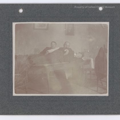 Update 2/2010: Sepia print. Snapshot. Mounted on grey matboard with floral border and two binding holes in top mat edge. Image of three men lying on top of a wooden table-first man is completely prone, two men behind him are raised upon one elbow. Portions of three framed pictures on wall behind them. Several wooden chairs in view; one with a suit coat hanging on it. Appears that it maybe a double exposure-what looks like bare trees can be seen in the lower half of image. Light areas throughout.