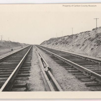 Update 1/2008: Black and white print. Snapshot. Image of two railroad tracks running between two dirt scrub covered hills. Telephone lines running along crest of both hills.