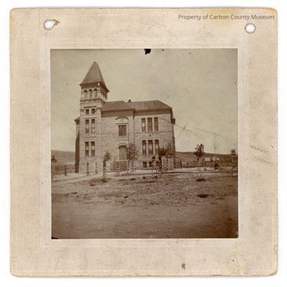 Update - January 2010: Sepia print. Snapshot. Mounted on off-white patterned matboard with "frame" around image & two binding holes in top edge. Image of a multi-story stone building with a tower to the left of the front door. Set on a raised foundation with a basement front door is accessible via a staircase. Unfinished yard with newly planted trees. Lower hills in the background.