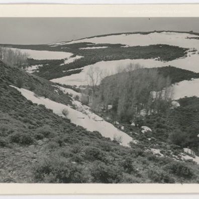 Update 1/2008: Black and white print, snapshot. Image of a shrub-covered ravine with patches of snow on the sides and two groves of trees in the bottom creek at bottom of ravine visible in lower right.