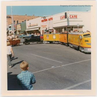 View 1. A small size Union Pacific train consisting of an engine & 4 cars with the last car full of children. There are 2 box cars, a tanker & the open car. It is turning a circle in the street. Business buildings on the north side of the street are "Cafe", "Western Auto", "Ben Franklin". Cars & people are on the sides of the street. On the photos stamped on back in red: "Kodacrome Print Made by Kodak Aug 67 PA".