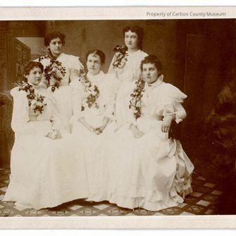 Update - January 2010: Cabinet card. Sepia print. Studio portrait. Mounted on patterned white matboard with "frame" around image. Image of five young women in white dresses posed in front of a painted backdrop. Each woman wears a large flower corsage & has her hair pinned up. Checkered tile floor under foot. Three of the women are seated & two are standing behind them.