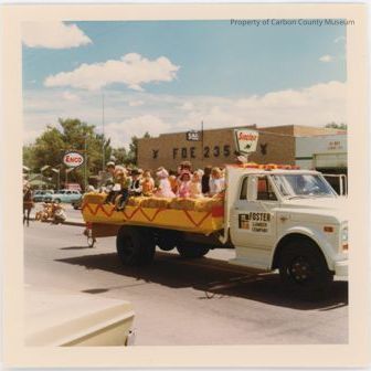 View 1. A flat bed truck, decorated, and children ride in the bed. Written on the cab door: "Foster Lumber Company"