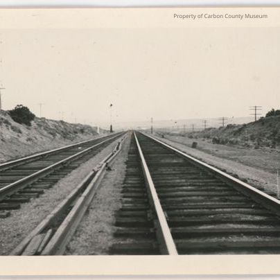 Update 1/2008: Black and white image. Snapshot. Image of two railroad tracks running between scrub-covered hills. Telephone lines running along crest of hills on both sides. Low hill in background.