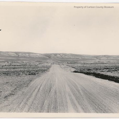 Update 2009: Black and white print of gravel road going toward hills. On both sides of road is brush. Road wide in photo foreground and it narrows and is no longer visible at the top of a hill. Then a small ribbon of winding road can be seen in the distance.