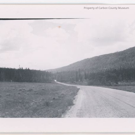 Update 2/2010: Black and white print of dirt road, going into a grove of pine trees. A pine covered mountain slope is on photo right.
