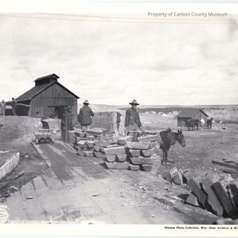 View 1: Image of a mine scene that has a wood platform with ingots sitting on edge. A solid wheel cart is at the far end. One man has his back toward camera & another is holding a sledge hammer. More men are in front of & beside a building. A mule team is hitched to a wagon on a lower level. Another building is in the distance on photo right. Printed on bottom in white: "Ingots of copper ready for shipment, Encampment". Good condition.
