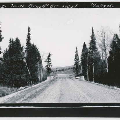 Update 2/2010: Black and white print and one negative of gravel road crossing a small bridge. Pine tres are on sides of the road. Bridge has low guard rails. Printed in white on top border: "Sta 18I South Brush Creek West 11/2/1936 2". On left side border: "Forest Hy 12I G2F1 Centennial-Saratoga 1936". Condition good. Borders irregular.