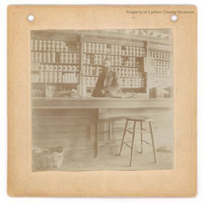 Update - 2009: Black & white print. Snapshot. Mounted on tan matboard with patterned border & two bunding holes along top edge. Image of the interior of a store with canned goods on shelves in background. Man standing behind solid counter. Stool & basket in foreground. Man is bearded & wearing a medium colored suit.
