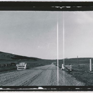 Update 2/2010: Black and white contact print and one negative of a gravel road with cattle guard. On sides of cattle guard are boards forming end that attaches to fence. Written in white on right border:"Centennial-Saratoga 11-2-1936 Sta. 115I West." Written on back in pencil: "Centennial-Saratoga 1936".