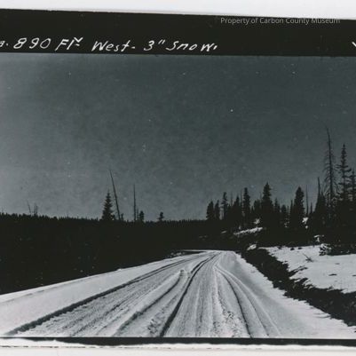 Update 2/2010: Black and white contact print and one negative of snow covered road with vehicle tracks on road. Pine trees are on sides of road and in distance. Written on left border in white : "Centennial -Saratoga 11/2/36: Written on top border in white: "Sta 890F west 3" snow". Written on back in pencil: "Centennial-Saratoga 1936".