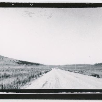 Update02/06/2010: Black and white print and 1 negative of a gravel road. On photo left of road is a fence and on photo right are high line poles. In the distance on left are aspen trees with no leaves and pines. Grass and brush border the road. Written on left border in white: "Sta.110-I looking west shows loose condition of surface 11/2/1936." On right border: "Forest Hy 12I-G2 F. Centennial-Saratoga".