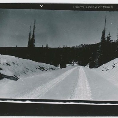 Update:02/06/2010: Black and white print and one negative of snow covered road with vehicle tracks through snow. Sides of road have incline from edge of barrow ditch. Road is going into trees in the distance.
