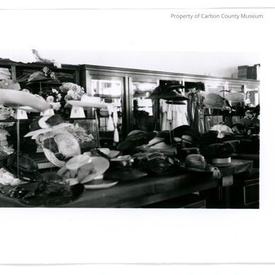 Photo of the interior of the Rawlins Mercantile Store. This view you see ladies hats.