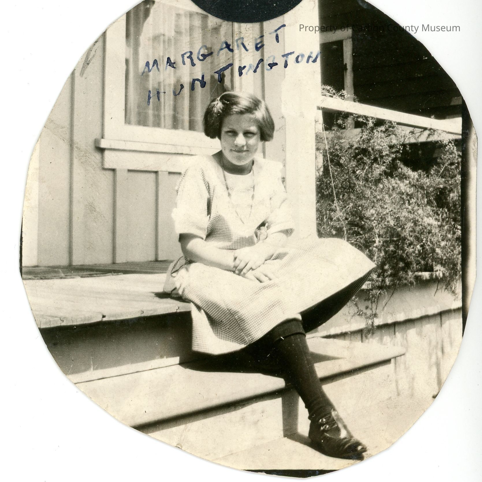 Black and white photograph cut into a circular shape. A girl is sitting on the front step/porch of a house. Written above her head is "MARGARET HUNTINGTON", written on the reverse is "daughter of Albert Huntington".Collection