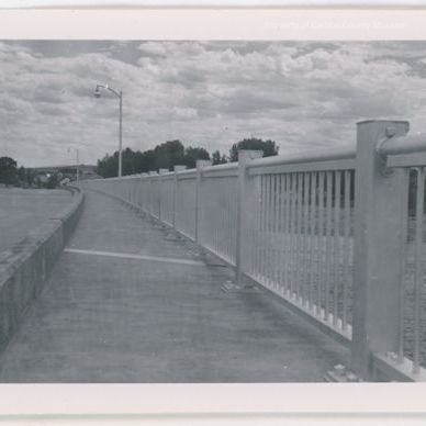 Update 3/2010: Black and white print of the top of a bridge. On photo right is pedestrian walkway and railing. A high curb is between walkway and highway. Overhead light poles are at bridge sides. On photo left, bridge looks the same. Trees and houses are seen in the distance.