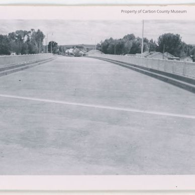 Written on back in pencil: "Bridge over North Platte River, Saratoga 1948-49."