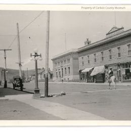 One copy print. Written on back in pencil: "Looking west on cedar: Stamped in black: "Photo Reproduction By Meyers Studio, Rawlins, Wyo"