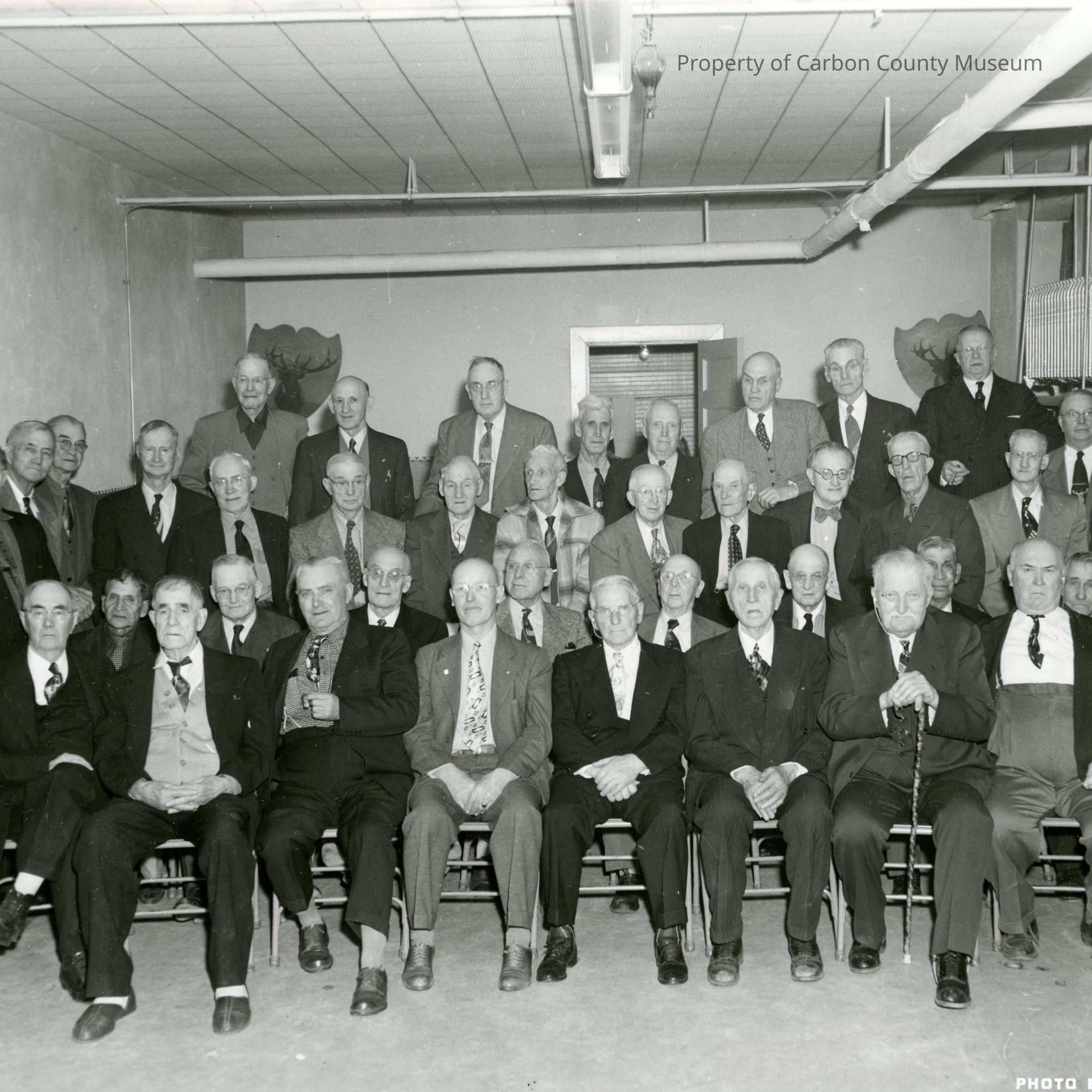 Picture of a group of men, 3 irregular rows, "Photo by Meyers, photographer", light brown wooden frame. Update: Approximately 40 men seated in 2 rows and standing in 2 rows, they are wearing suits and ties. Wood plaques are behind them on the wall with elk heads on them. A heat register is high on a shelf on the right . pipes are above their heads as if they might be in a lower level. Size: 8 x 10 1/8.