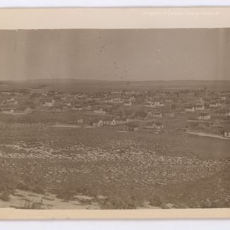 Update - 2009: Sepia print. Printed on postcard paper. Image from slight elevation of a town laid out on the prairie. Hills in the background. Large multi-story stone buildings at right & left in background.