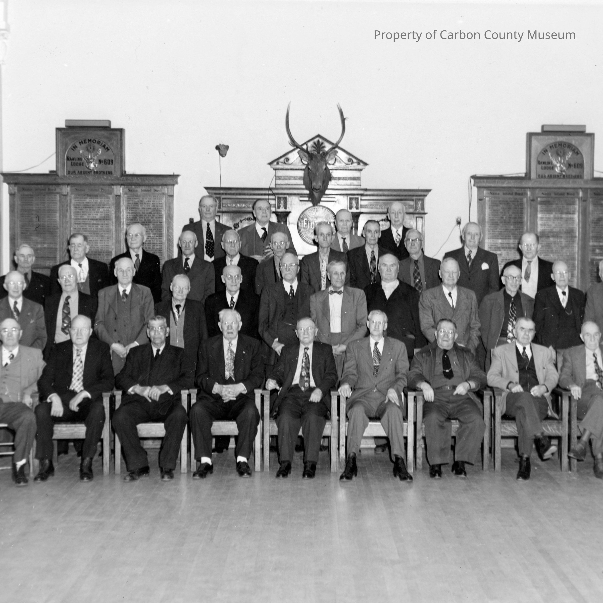 Picture of a group of men, 4 rows, "Photo by Meyers", ivory colored wooden frame. Update: Approximately 40 men seated and standing in 4 rows, they are wearing suits and ties . An elk mount is above and behind them, wood cabinets with plaques attached is below the elk mount. Possibly over 70's club. Size 8 1/4 x 10 1/4