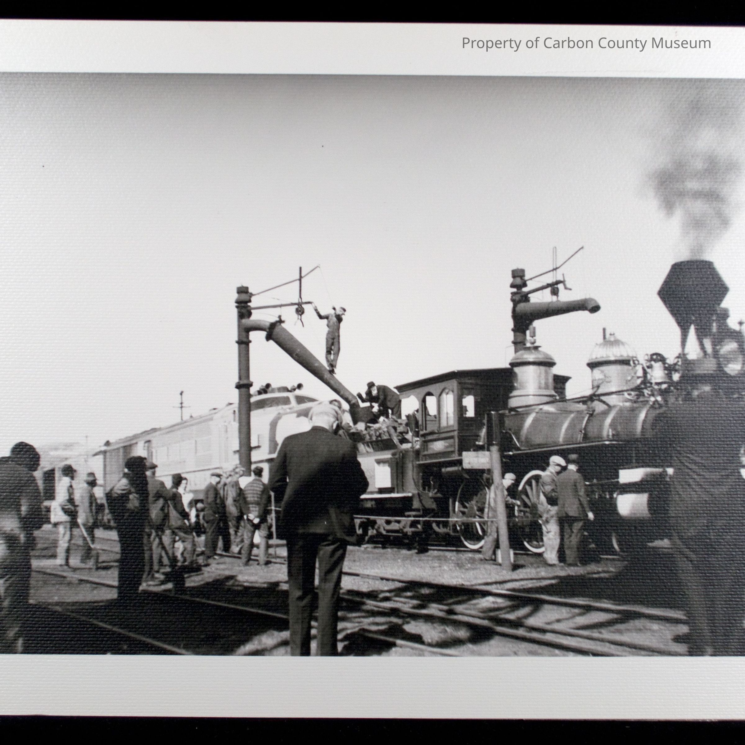 Gold framed photo of "Old Engine", a replica of the first steam locomotive on the completed Union Pacific Railroad in 1868. It came through advertising the movie "Union Pacific. On back of picture, "taken June 29, 1917, at Rawlins, WY." Felt back.