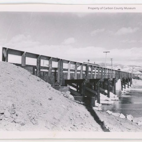 Update 3/2010: Two black and white prints of bridge over North Platte River in Saratoga. Written on back in pencil: "Timber Bridge-Saratoga built: Spring of 1944 to replace old steel tress bridge wrecked in Dec. 1943. State project 213D".