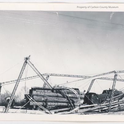 1. Written on the back in pencil: "Saratoga Bridge: West Span wrecked by truck load of logs 8:30 pm Dec 3, 1943-close up of truck". Condition good. Creased vertically, corners bent, emulsion impacted by writing on back.