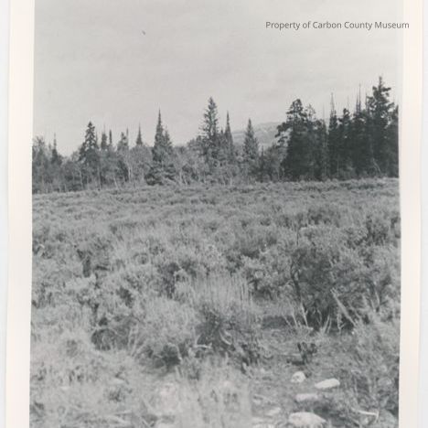 Update 3/2010: Black and white print of grass, brush and rocks in foreground with aspen and pine trees behind. A mountain can be seen in the distance. Written on back in black ink: "Centennial-Saratoga Medicine Bow Lodge to West Forest Boundary. Summer 1933 BBR. Looking ahead on line-west sta. 12+50". Condition: Good, emulsion impacted by writing on the back.Collection