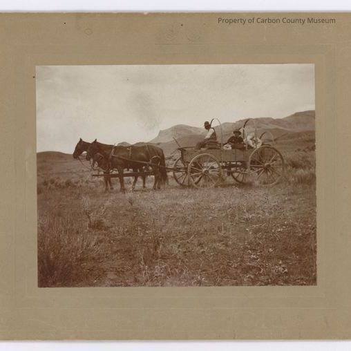 Photo of people in a horsedrawn wagon with their supplies from Battle Mountain Mines.
