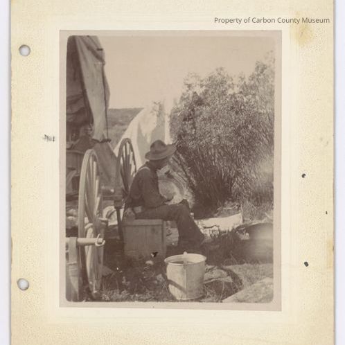 Update 2/2008: Black and white print. Mounted on off white matboard with patterned border and two holes in left side for binding. Image of a man seated on a crate next to a wagon. He is holding a flat circular pan and appears to be mixing food, perhaps biscuits. Other pans can be seen at right. Bucket is in the foreground. Bush and tent in the background. Appears to be smoke rising along right side. Wagon is partially covered with canvas. Man is dressed in dark pants, dark striped shirt, white suspenders, hat and boots.
