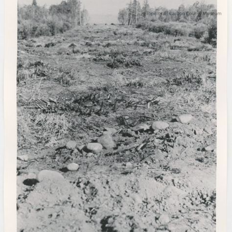 Update - March 2010: Black & white print of ground under construction to be a road bed. Rocks, brush & trees have been scraped to show where road will be built. An opening between trees is in the distance.