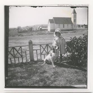 Black & white snapshot print. Image of a small girl standing outside next to a fence & a bush. A dog is sitting beside her & she wears a dress & bonnet with dark socks & shoes. A church is in the background on photo right & houses beyond.