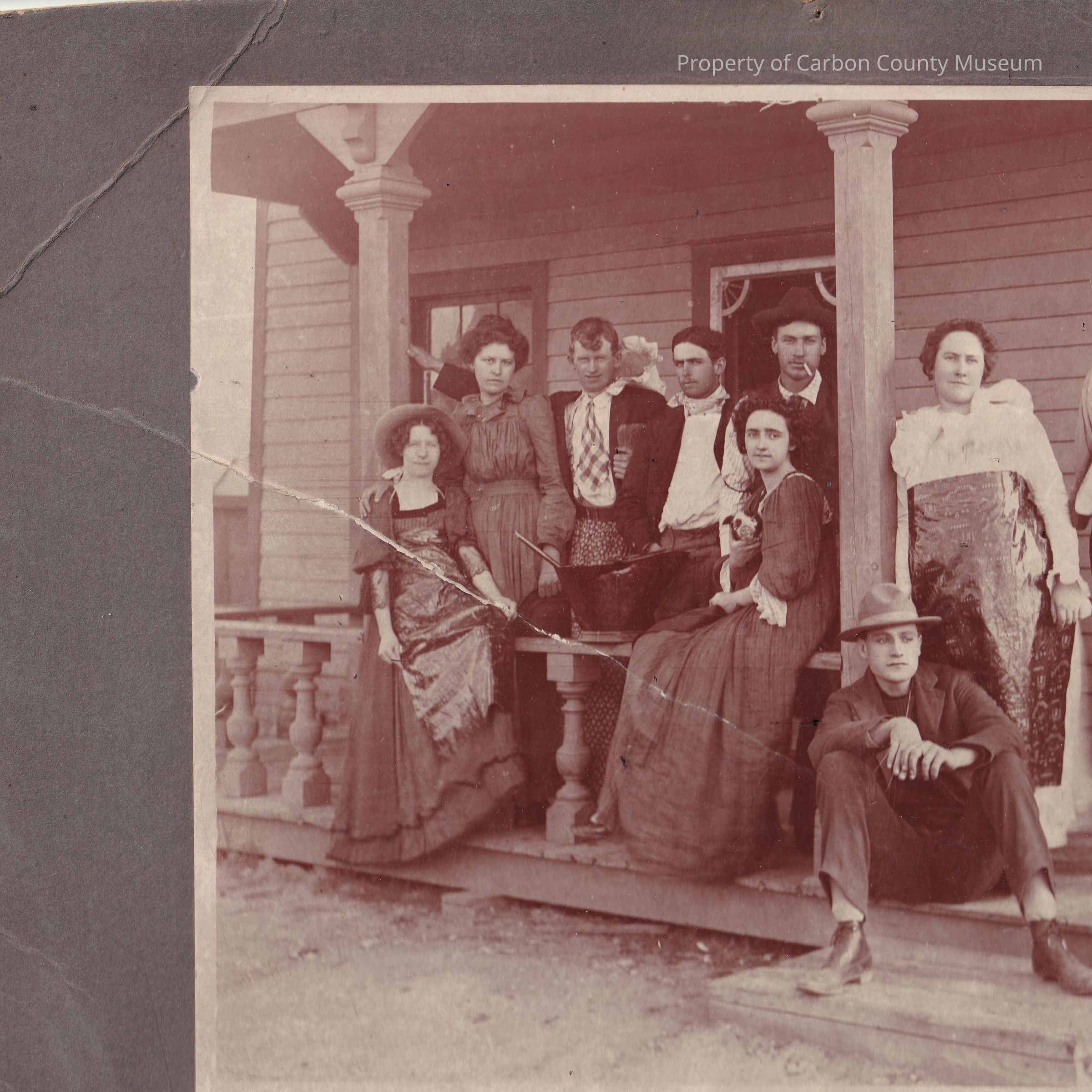 Oversized cabinet card photograph, sepia tone photograph of a group of people - six men, four women - on the porch of a house. One of the women is holding a small piglet.Collection