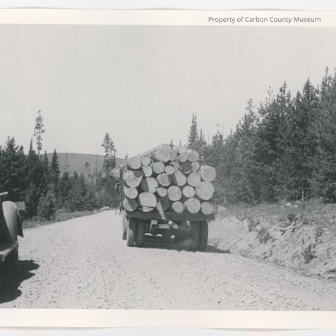 Written on back in black ink: Centennial - Saratoga West forest Bdy. - East Survey report 1939. Photo showing type of heavy hauling over this highway. An average of 6 trucks haul 16-24 hours daily Sta 195, Sec G. July 1939"