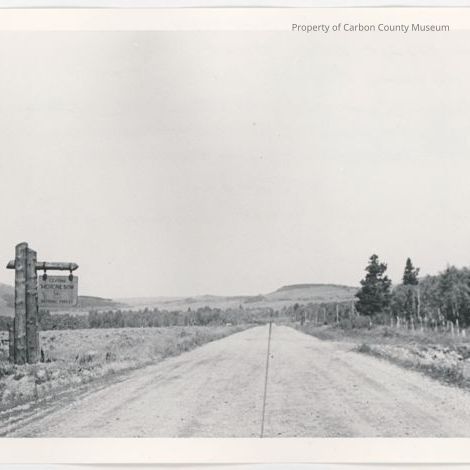 Update 2/2010: Black and white print of gravel road. Sign on photo left reads: "Leaving Medicine Bow National Forest."