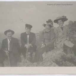 Update - 2009: Black & white print. Printed on postcard paper. Image of two men and two women seated on rocks on a sagebrush covered hillside. Men are in dark suits & ties (one long & one a bow tie); both are wearing hats (fedora & a cap); man at left is holding a rifle; other man has a small twisted "cane/walking stick". Women are in dresses & coats; both are wearing large hats with flowers.