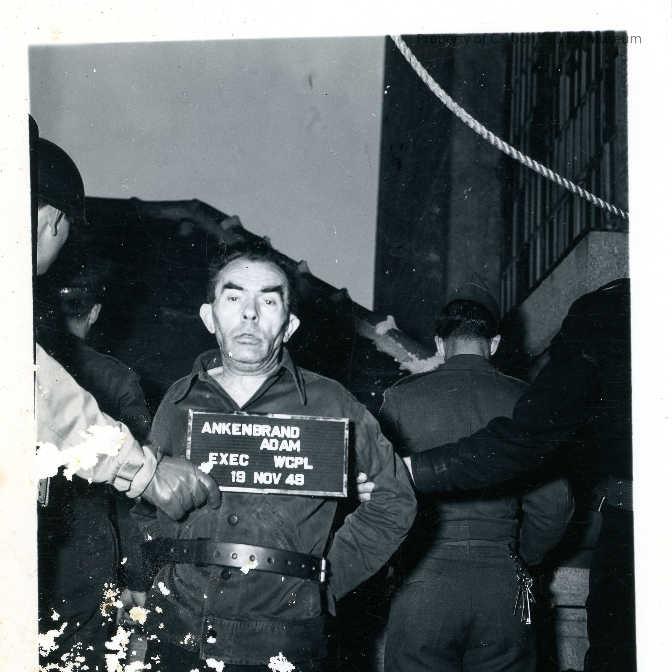 Black and white photograph of a man in a prisoner uniform, he is being held by two men out of frame. Behind the three are two men in military uniforms with their backs to the camera. A placard held in front of the prisoner reads "Ankenbrand Adam EXEC WCPL 19 Nov 48", a length of rope is visible in the top right corner, their is damage to the negative in the bottom left corner.