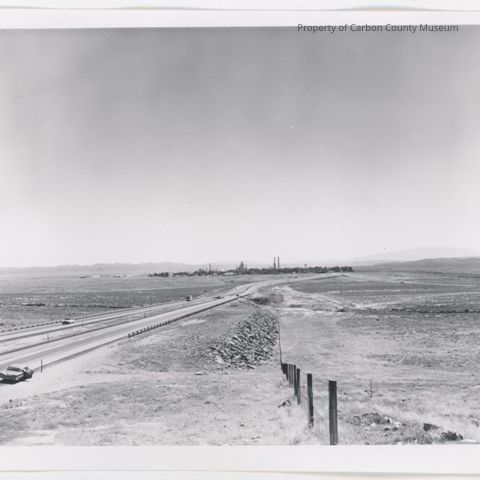 Update - March 2010: Black &white print of highway looking toward Sinclair. East & west divided highway west of Sinclair, WY in photo center. Sinclair is in the distance. Fence posts on photo right. Gravel embankment is on south side of highway. Two vehicles are in west bound lane. A vehicle is parked on shoulder in east bound lane.