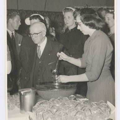 Update - 2009: Black & white print. Image of group of men & women gathered at a punch bowl. Tray of glass cups in foreground. Pitcher & glass cups on table with punch bowl. Woman in a sweater dress dipping punch into glass at right. Older man in dark suit next to table at center. Other people in background.
