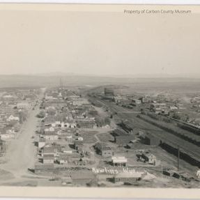 Black & white print card. Birds eye view of late 1920's Rawlins. Looking east down Cedar Street. The railroad tracks are on photo right. Houses & businesses line both sides of Cedar Street & more are seen on both sides of the tracks. Printed in white at bottom on original negative: "Rawlins,Wyo" "Meyers Photo".