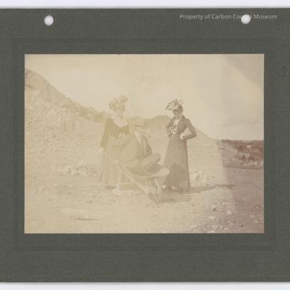 Update - 2009: Sepia print. Mounted on grey matboard with patterned border & two binding holes at top. Image of two women standing on a rocky slope with a man in a wheelbarrow. One of the women is holding the handles of the wheelbarrow; the other is looking at the man & has her hands on her hips. Both women are in dresses & large fancy hats. Man is wearing a 3-pc suit, light shirt, tie & fedora.