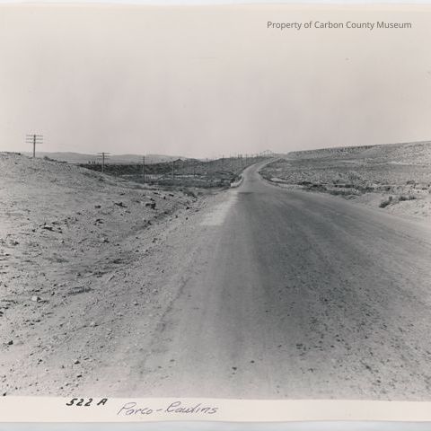 Update -March 2010: Black & white print of highway. There is a dirt embankment on photo left, railroad tracks & high line poles beyond on left. Road has guard rails on sides where going over a draw. Highway in distance goes up an incline. Bush & grass are on sides of highway.