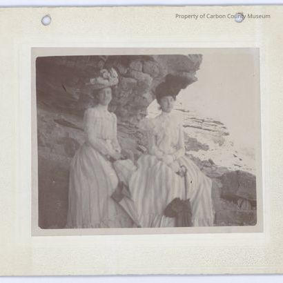 Update - 2009: Black & white print. Mounted on off-white matboard with patterned border & two binding holes on top edge. Image of two women seated on rocks under rock overhang. More rocks in background. women wearing white striped dresses & fancy hats; each is holding the handle of a parasol. Slightly out of focus.