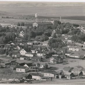 Black & white print card. Image of a residential area north and west of the Old Wyoming State Penitentiary. The back of the Penitentiary is seen beyond trees. Photo is taken looking southeast. Printed in white at bottom: "Penitentiary and Section of Rawlins, Wyoming". "Sanborn Y1264".